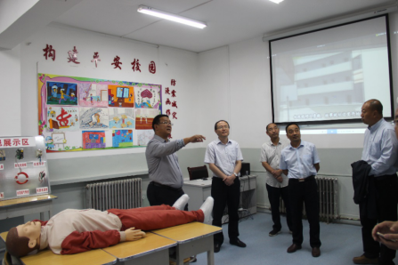 张有林在吉木乃县副县长李向阳(右1)等陪同下察看学校地震科普园地建设